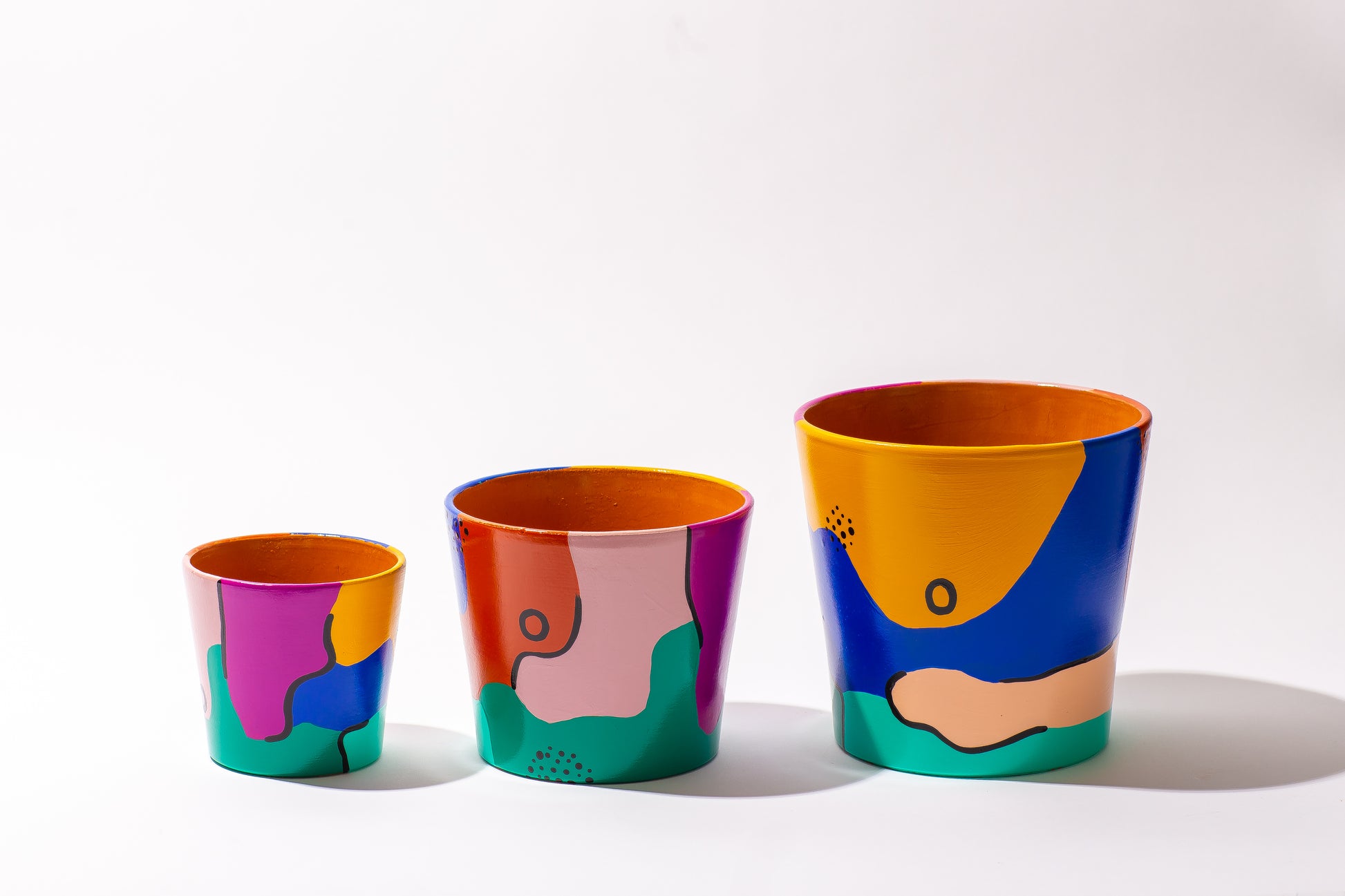 Three handprinted terracotta pots sizes 5", 6.5, "7.5".