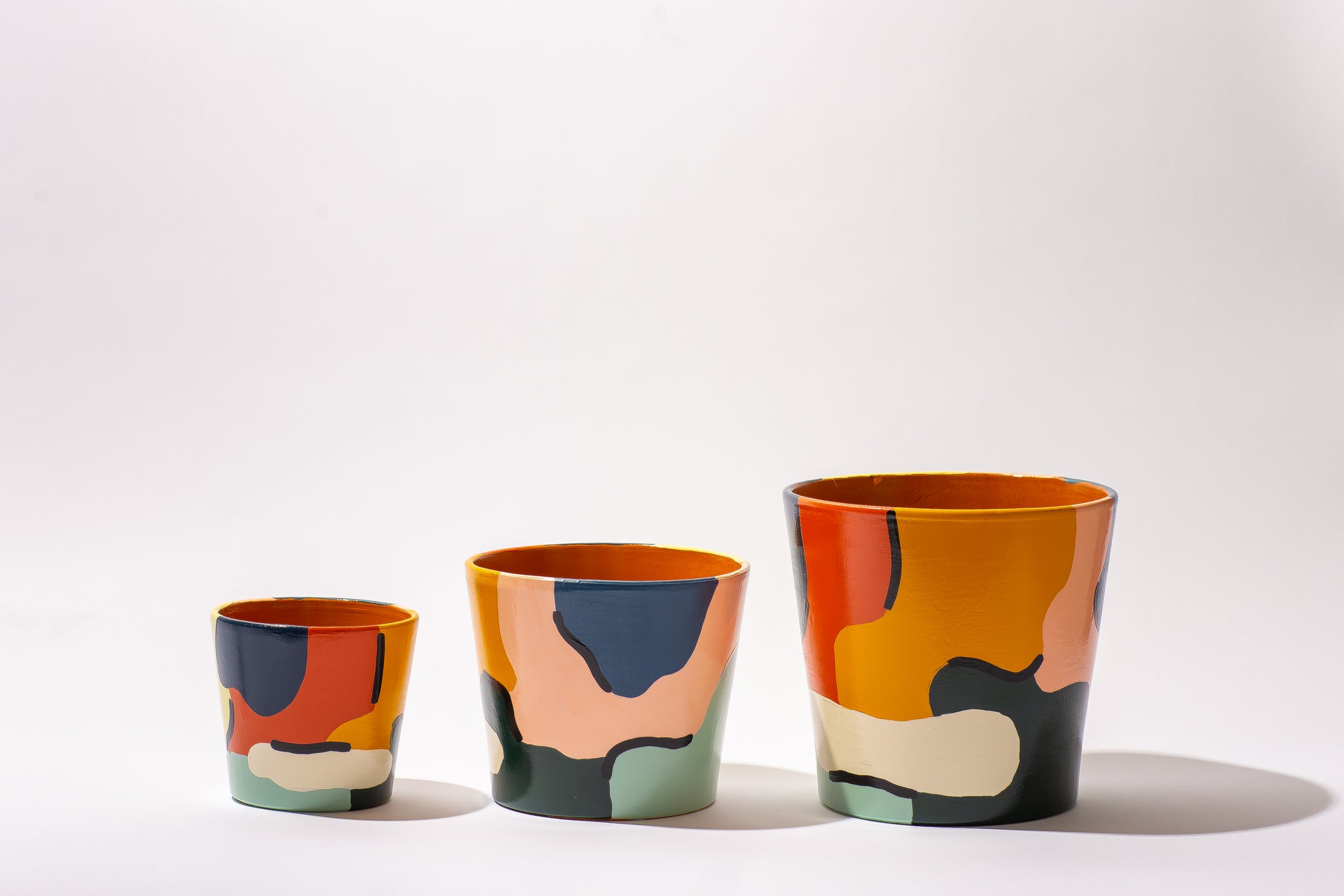 Three handprinted terracotta pots sizes 5",6.5"7.5".