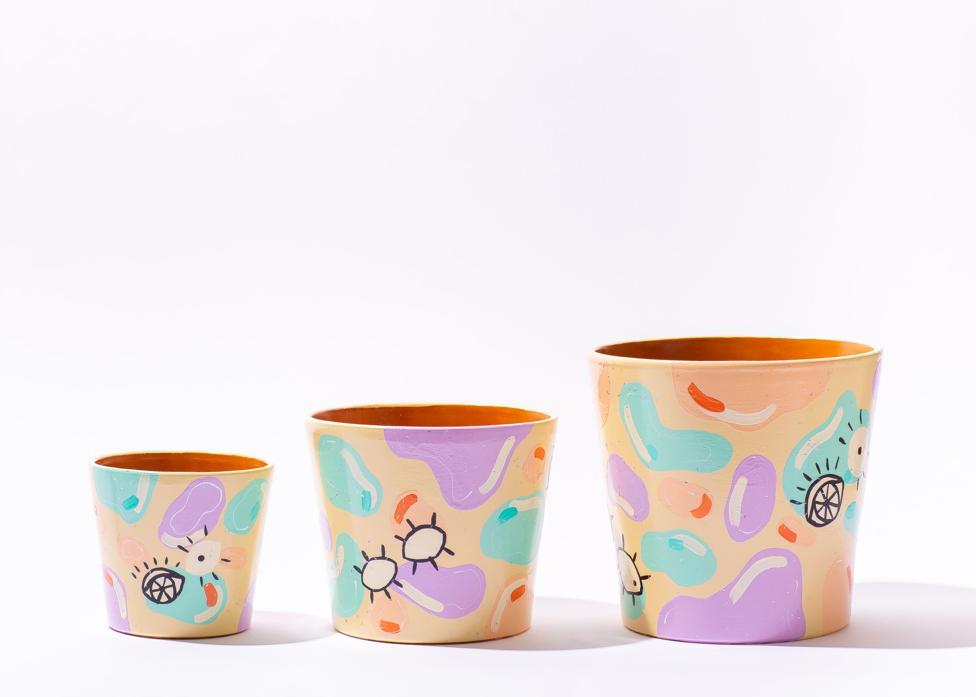 Three handprinted terracotta pots sizes 5",6.5"7.5".