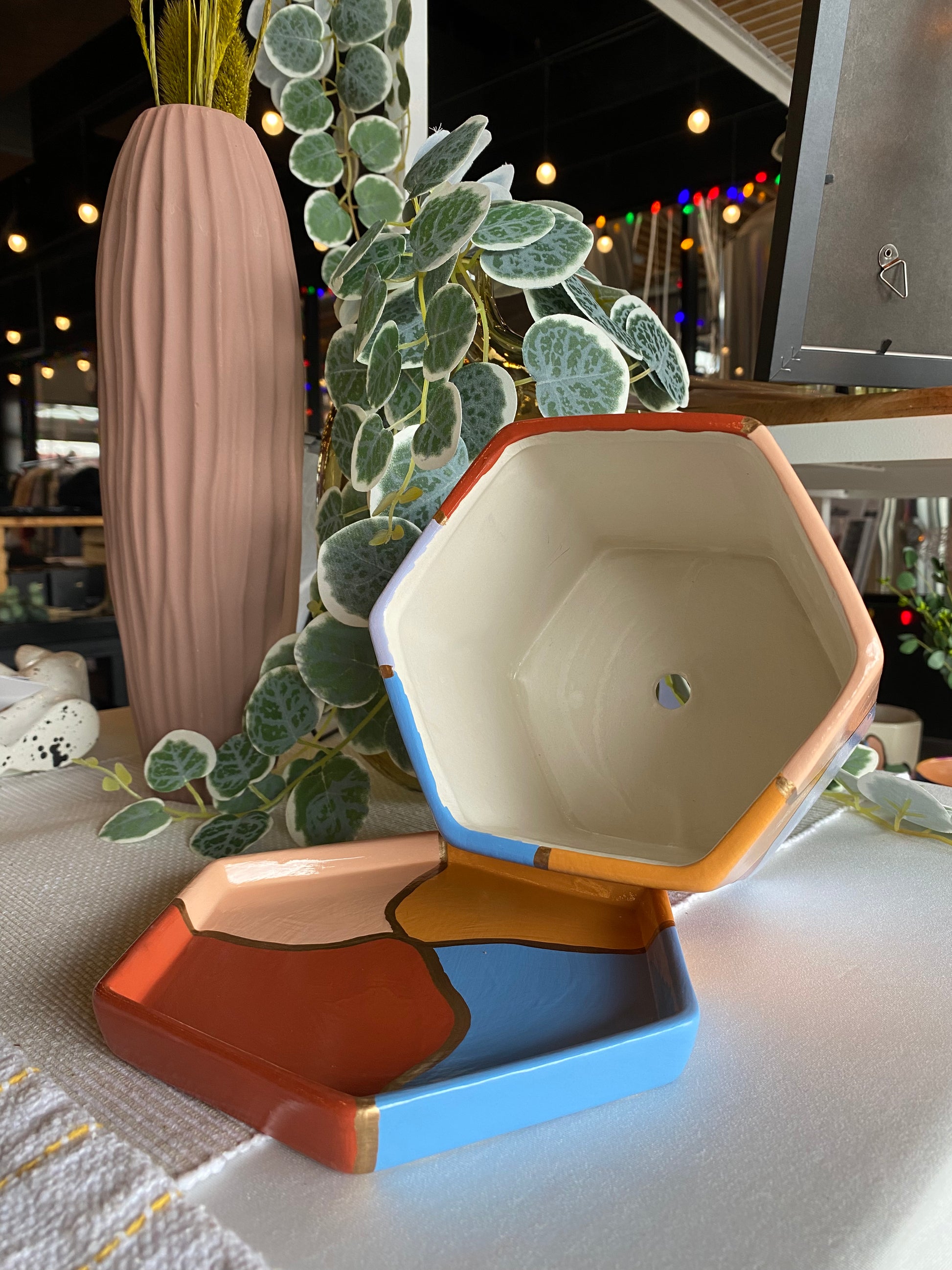 A stylish and practical solution for displaying your favorite plants. This sleek planter features a unique hexagon shape, adding a modern touch to any space. Crafted with high-quality materials, it provides a sturdy and durable home for your plants, while the included tray helps to catch excess water and keep your surfaces clean. With its versatile design and convenient tray, this hexagon planter is perfect for indoor use. Elevate your plant game with our Hexagon Shaped Planter with Tray and add a touch of contemporary elegance to your home or garden.